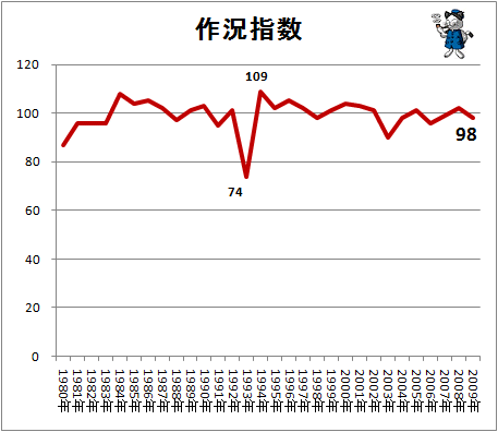 ニュースワード「作況指数」 作況指数 コメの作柄を表す指標。直近30年間の傾向から割り出した10アール当たりの平年収量を100として、その年の収量の比率を示す。実際にふるいを… (出典:時事通信) |